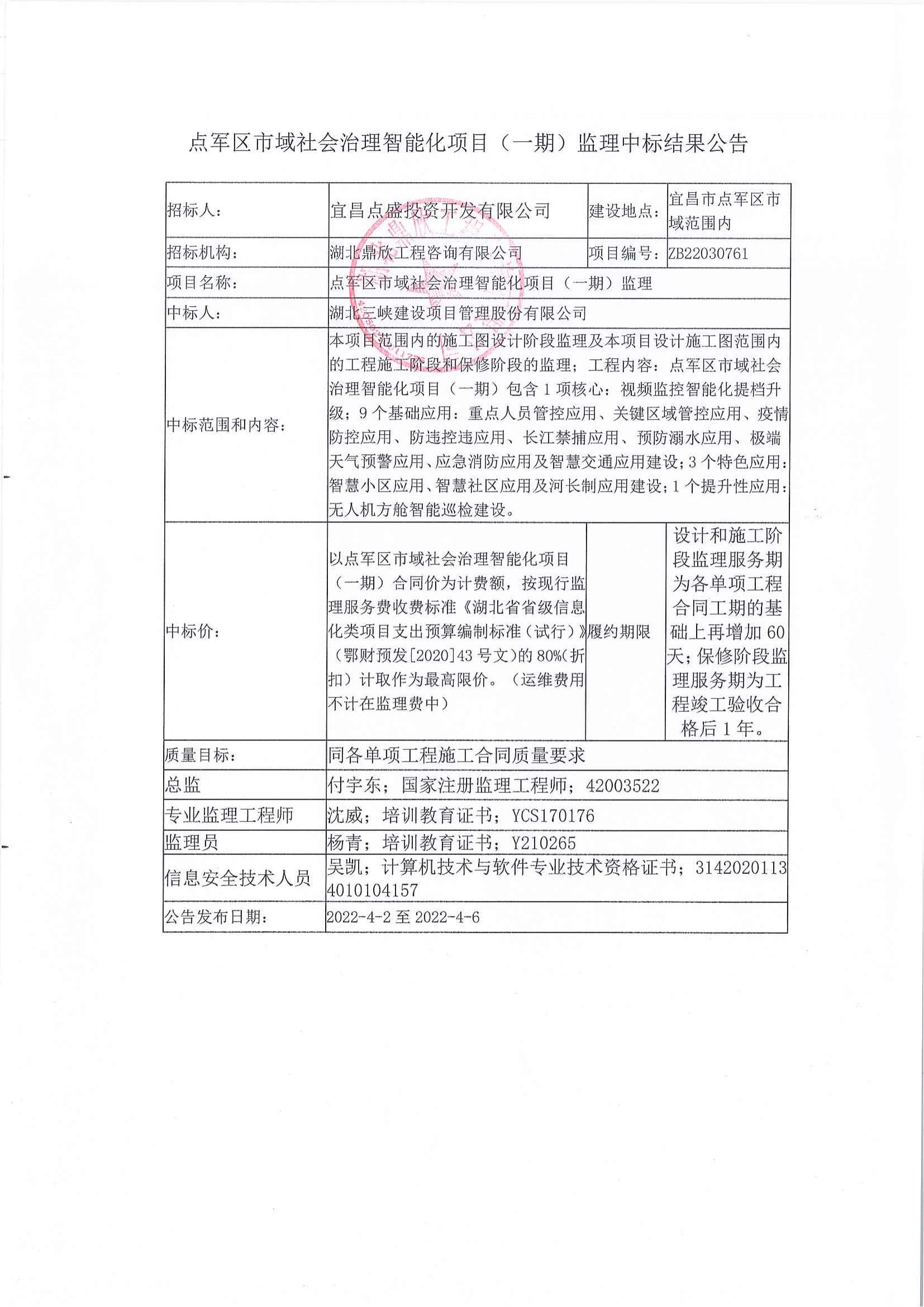 點軍區市域社會治理智能化項目(一期)?監理中標結果公告