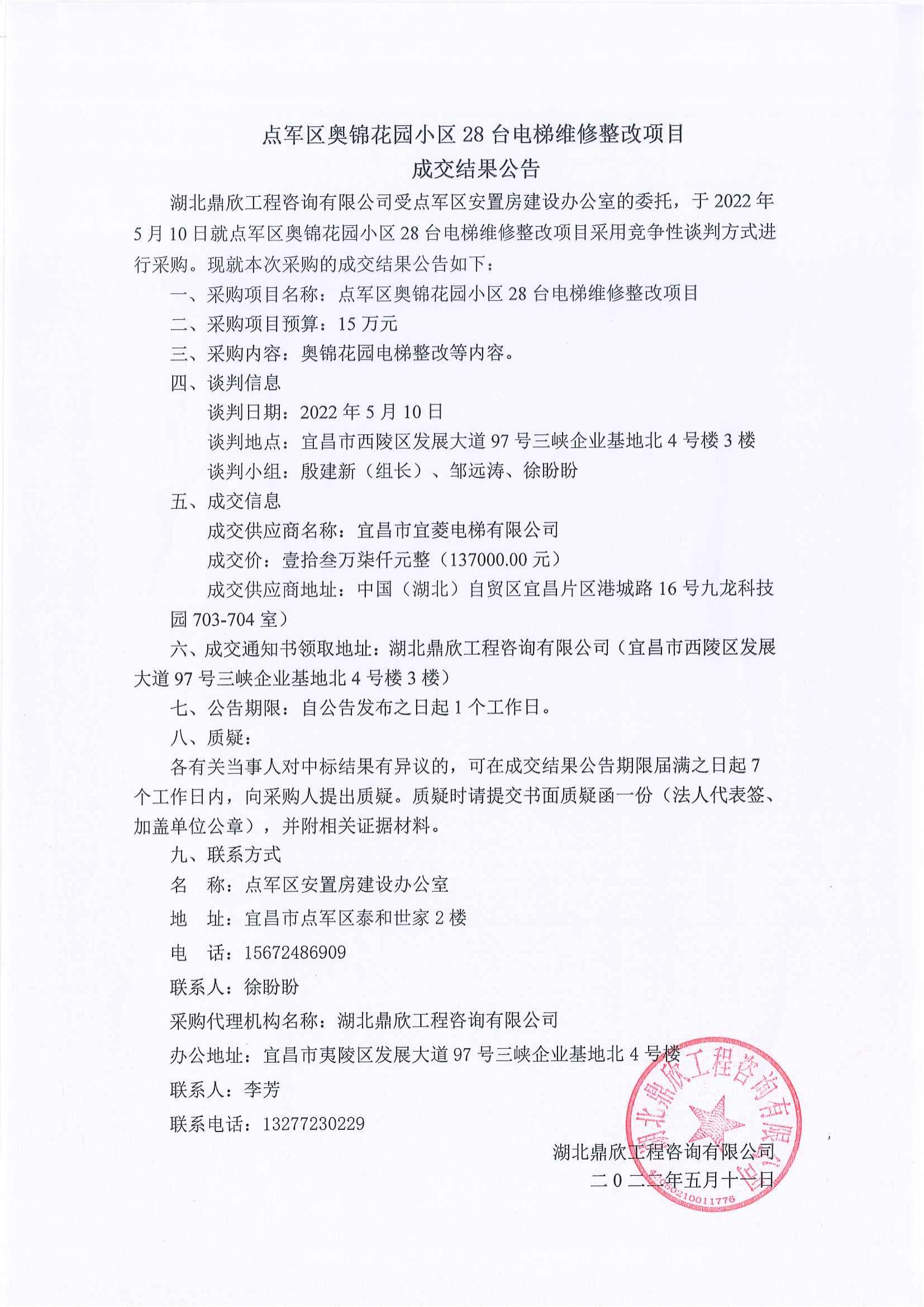 點軍區奧錦花園小區28臺電梯維修整改項目成交公告