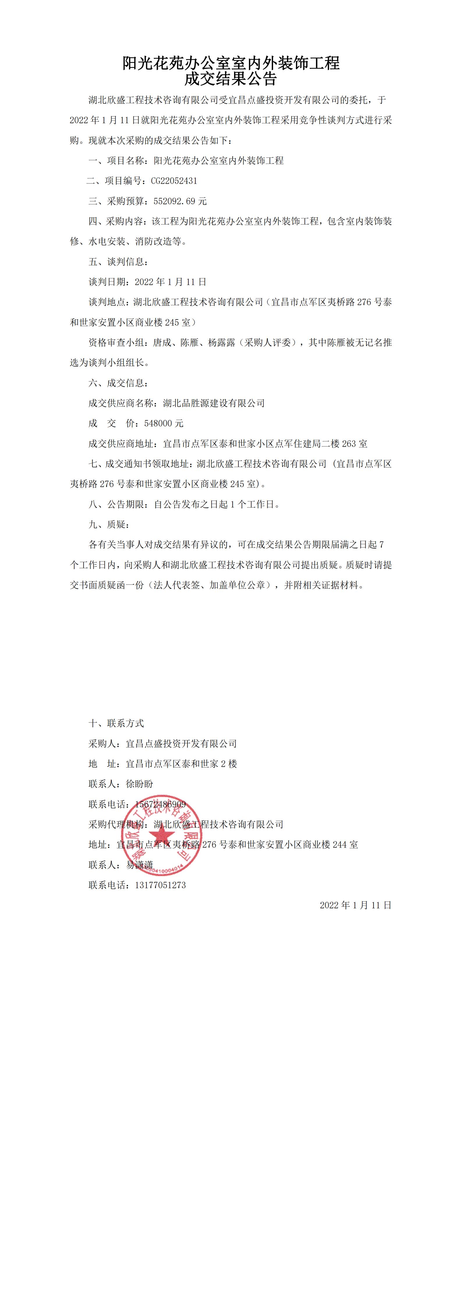 陽光花苑辦公室室內外裝飾工程成交結果公告