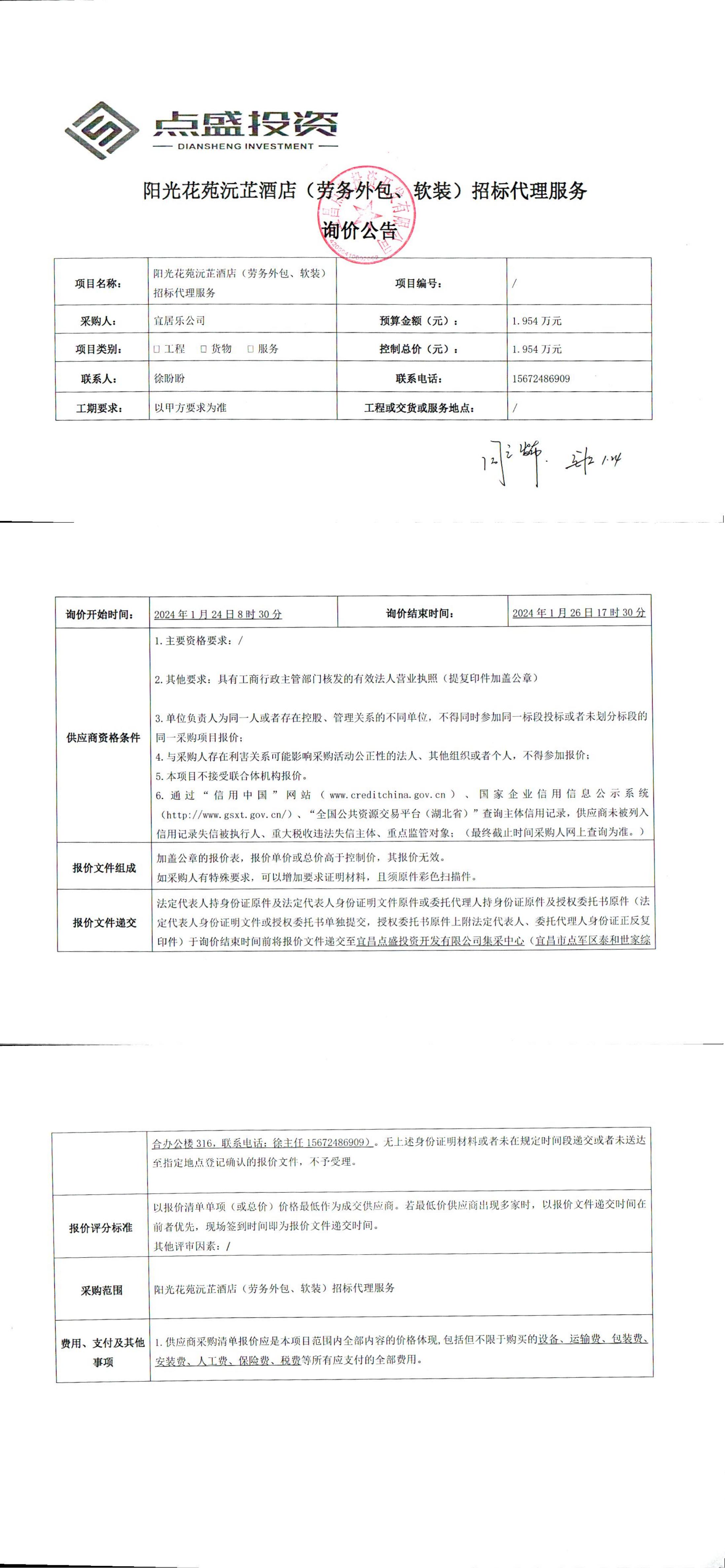 陽光花苑沅芷酒店(勞務外包、軟裝)招標代理服務?詢價公告