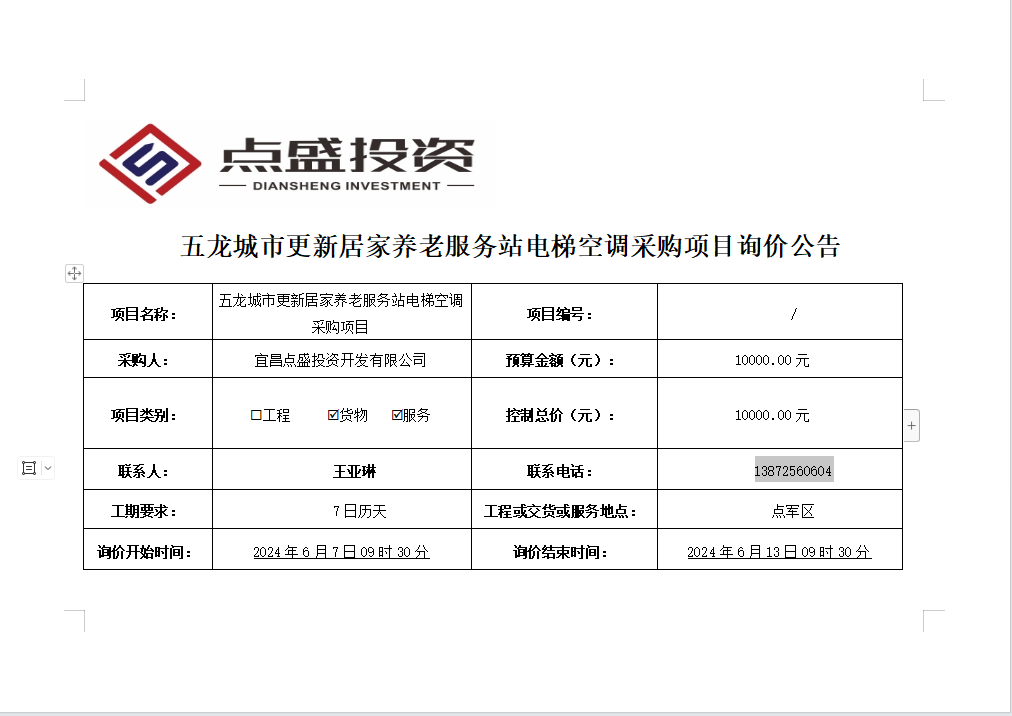 五龍城市更新居家養老服務站電梯空調采購項目詢價公告