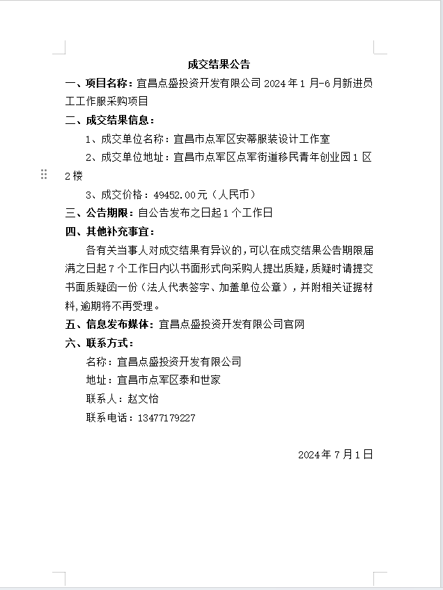 宜昌點盛投資開發有限公司2024年1月-6月新進員工工作服采購項目成交公告