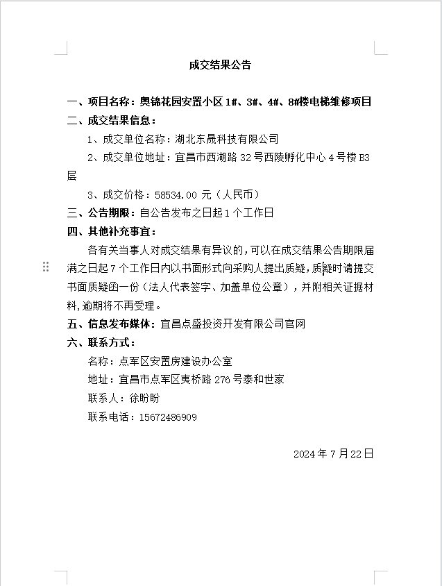 奧錦花園安置小區1#、3#、4#、8#樓電梯維修項目成交公告