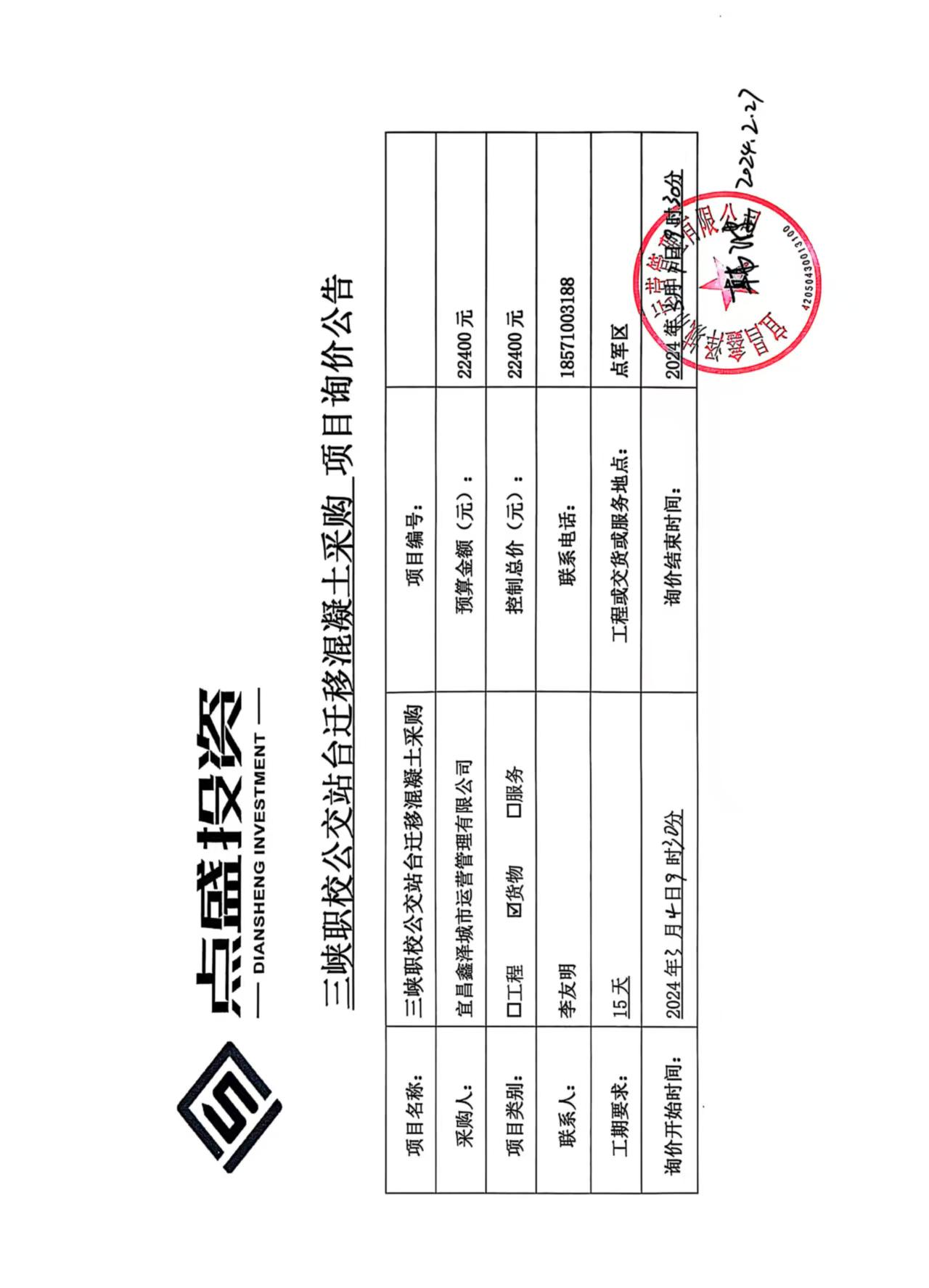 三峽職校公交站臺(tái)遷移混凝土采購(gòu)詢價(jià)公告